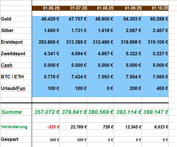 Diese Übersicht ist die wichtigste in meiner Datei, daher kommt sie auch ganz vorne. Seit 127 Monaten, also über 10 Jahren, trage ich hier am Ende jeden Monats den aktuellen Wert meiner Assets ein. Darunter lasse ich mir dann summiert mein Gesamtvermögen berechnen. Auch die Veränderung (Zuwachs / Verlust) im Vergleich zum Vormonat habe ich abgebildet. Dazu kommt noch der Betrag, den ich im aktuellen Monat gespart habe. Man kann sehen, die letzten Monate waren gut zu mir. Den Oktober habe ich mal mit den aktuellen Daten gepflegt – endgültig wird das erst am letzten Tag des Monats eingetragen.