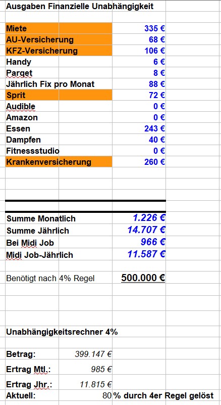 Dann habe ich noch eine vorläufige Berechnung zu meiner finanziellen Unabhängigkeit aufgestellt. Hierbei geht es ausschließlich um das benötigte Kapital zu Deckung der absoluten Grundkosten. Von finanzieller Freiheit kann hier auch bei Erreichen noch keine Rede sein.