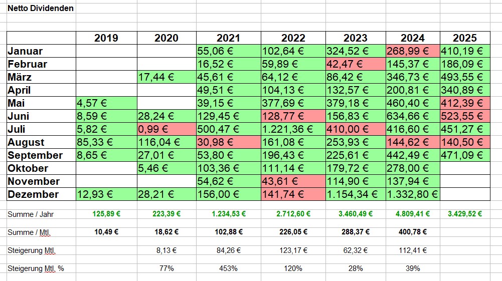 Dieser Reiter ist ganz simpel. Hier trage ich jeden Monat meine erhaltenen Nettodividenden ein. Ist ein Monat besser ausgefallen als der des Vorjahres, wird er grün gefärbt. Darunter wird dann noch die jährliche Summe gezogen und der Monatsdurchschnitt ermittelt. Dazu noch die Steigerungen in absoluten Zahlen und prozentual. Es ist schön zu sehen, wie der schwache Dollar bei meinem US-lastigen Depot meinem Dividendenwachstum in Euro momentan zusetzt und es ausbremst. Ich bin aber sicher, dass das nicht ewig so bleiben wird.
