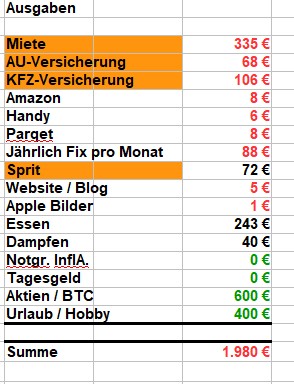 Hier habe ich dann meine monatlichen Ausgaben inklusive meiner Sparrate (grün) aufgelistet. Die Postition „Jährlich Fix pro Monat“ ist die oben errechnete Summe. Dazu kommen hier alle regelmäßig anfallenden Kosten wie Essen, Amazon Prime, Handy-Vertrag usw.