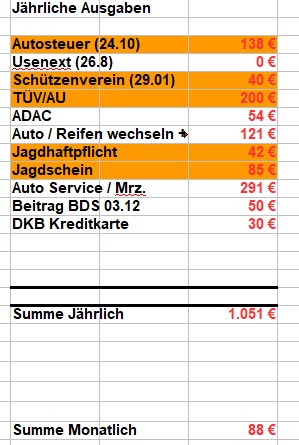 In meinem Budget-Reiter kommt ein ganzes Sammelsurium von Daten zusammen. Zum einen rechne ich mir hier aus, welche Kosten fix jedes Jahr auf mich zukommen. Dazu gehören die Autosteuer, jährliche Abos, Versicherungen und andere Jahresbeiträge. Daraus ermittle ich dann einen Monatsdurchschnittswert, den ich in der nächsten Aufstellung mit einfließen lasse.