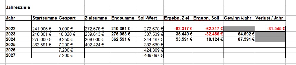 Als nächstes führe ich hier Buch über meine Jahres-Vermögensziele. Ich rechne hier mit einem sehr optimistischen jährlichen Durchschnittswachstum von 9%. Am Ende des Jahres kann ich dann sehen, ob ich mein Ziel erreicht habe und wie viel ich tatsächlich gespart habe. Natürlich bin ich hier sehr abhängig von der Marktentwicklung und kann mit meiner Sparrate mittlerweile nicht mehr viel Einfluss auf das Wachstum nehmen.